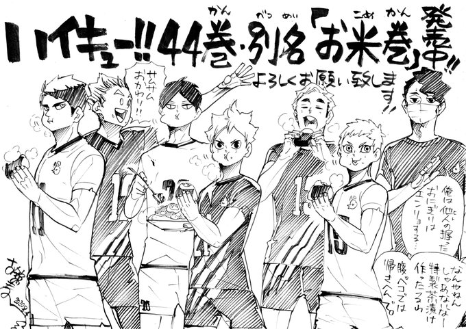 ハイキュー 最新44巻の宣伝イラストが到着 お米巻 に相応しくみんなでおにぎりを頬張る中 影山は ニコニコニュース